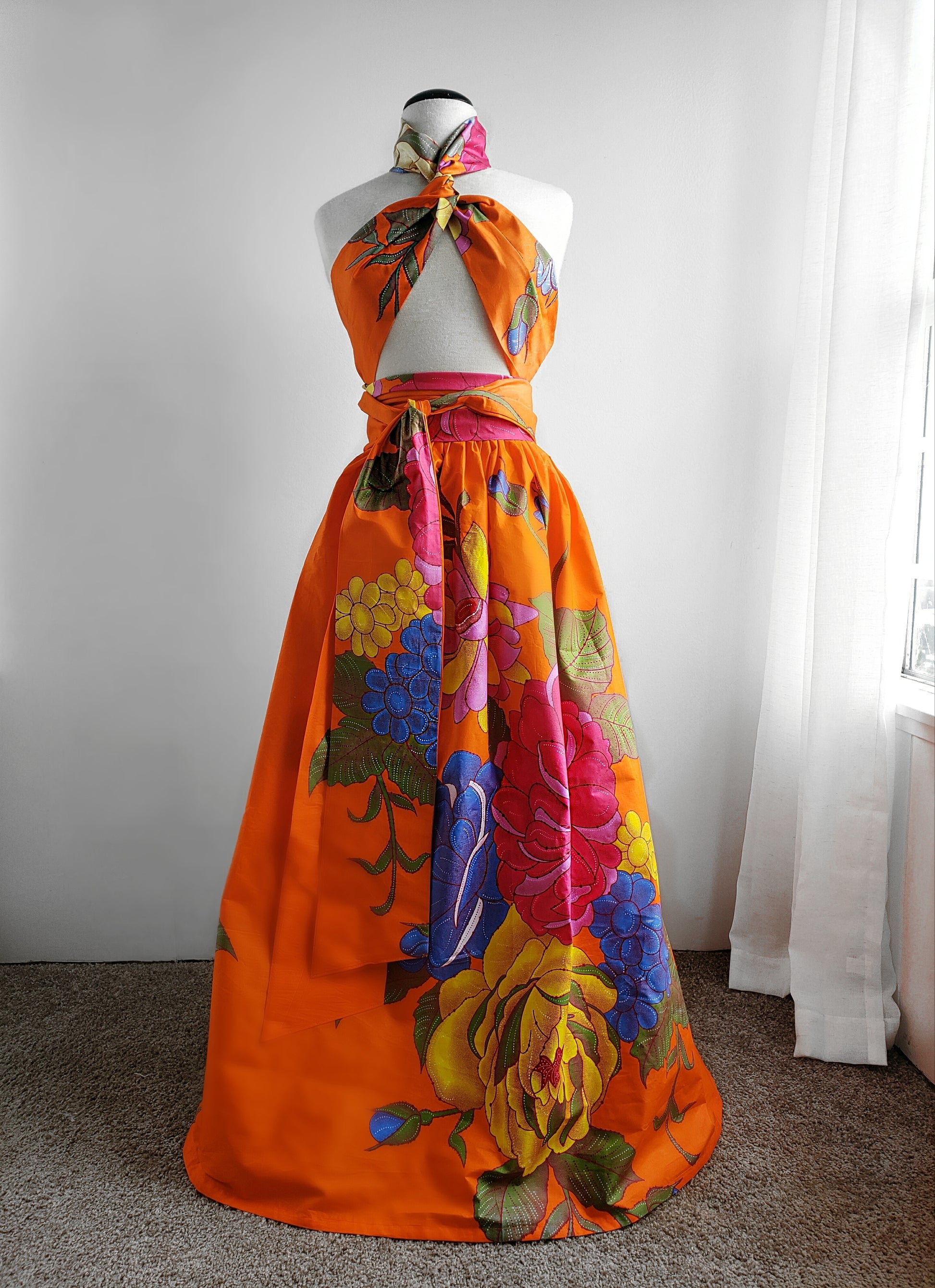 Make a statement in this gorgeous large floral print set. The scarf style top (as seen on white and orange set) wraps around the neck, wist and tie around the waist for a flexible fit. Can be worn as creatively is you like! The full skirt can be custom made as a midi or maxi.
